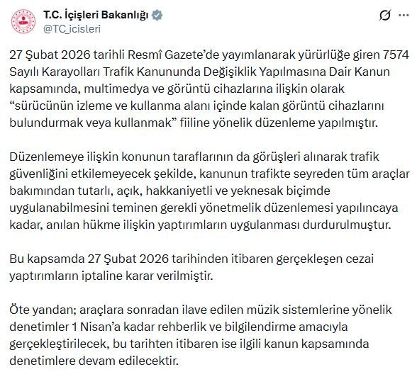 Bakanlığın sanal medya hesabından yapılan açıklamada, “27 Şubat 2026 tarihli Resmi Gazete’de yayımlanarak yürürlüğe giren 7574 Sayılı Karayolları Trafik Kanununda Değişiklik Yapılmasına Dair Kanun kapsamında, multimedya ve görüntü cihazlarına ilişkin olarak ‘sürücünün izleme ve kullanma alanı içinde kalan görüntü cihazlarını bulundurmak veya kullanmak’ fiiline yönelik düzenleme yapılmıştır.
